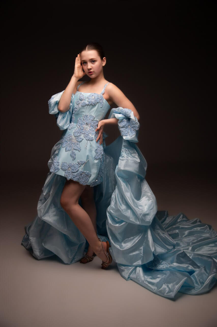 Regal yet ethereal, the Bluebell Majesty gown brings high fantasy to life with a touch of modern elegance. Crafted in soft sky-blue taffeta, the mini dress is adorned with delicate floral appliqués and crystal accents, while detachable puffed sleeves and a sweeping overskirt create a dramatic, fairy-tale silhouette.