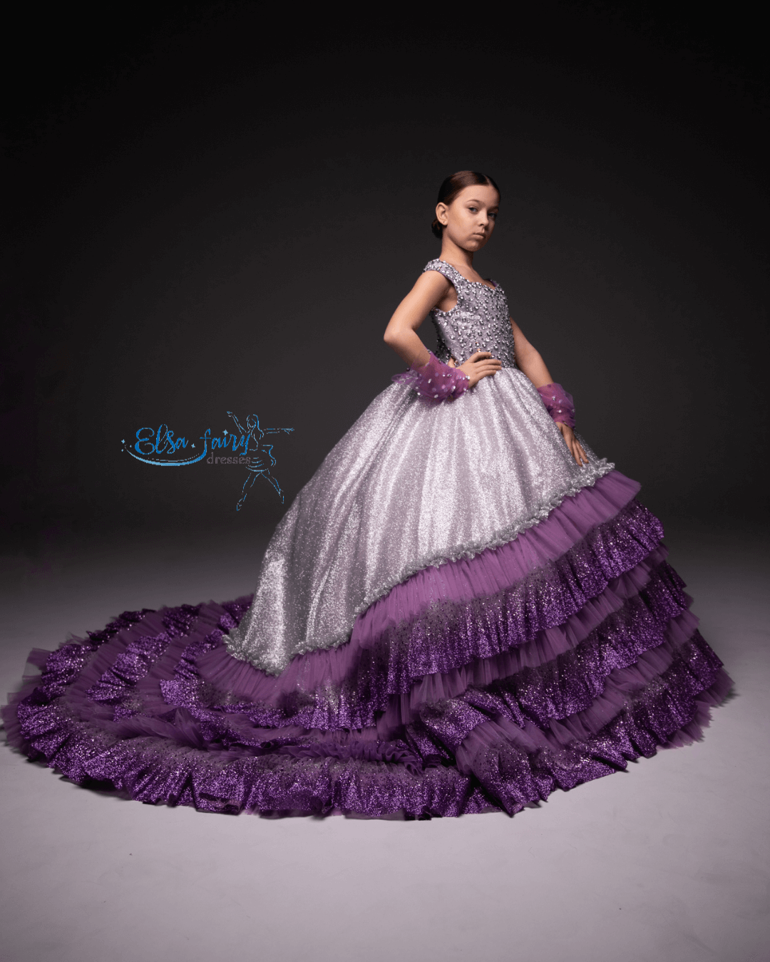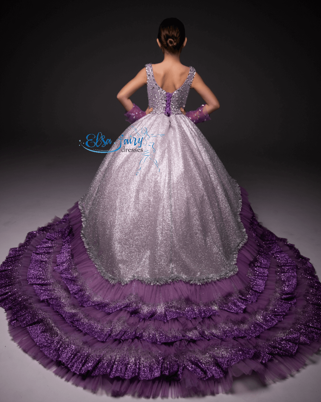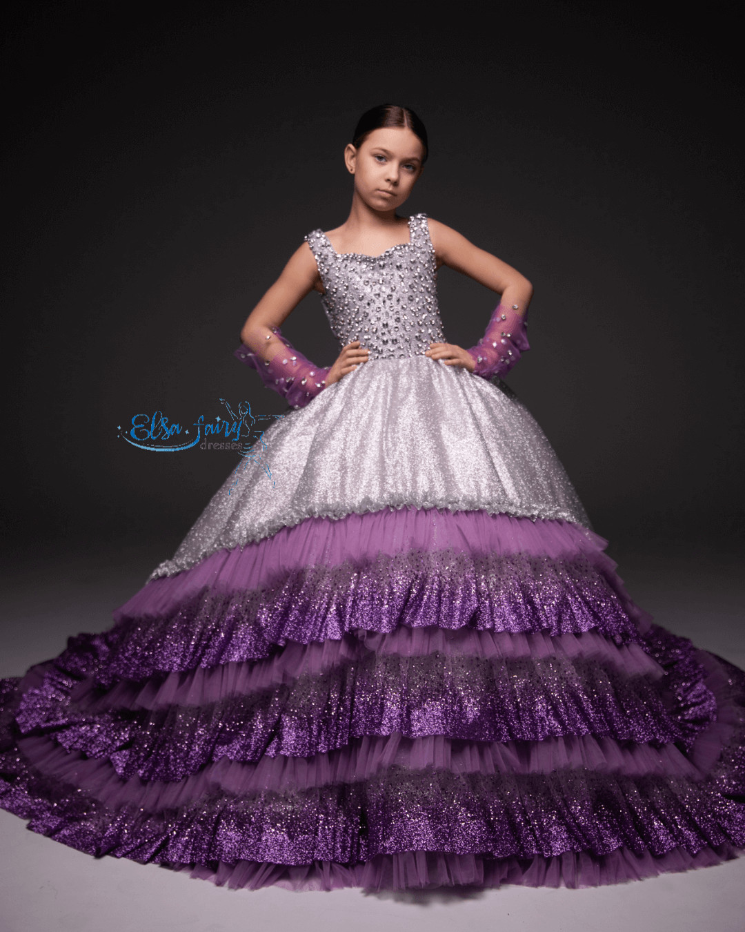 Luxury evening gown, exclusively designed and created by pre order for each customer. A floor-length handcrafter multi layered skirt from glitter, beaded and stoned bodice with boat-neckline. The back features a gorgeous long train, adding a touch of glamour.