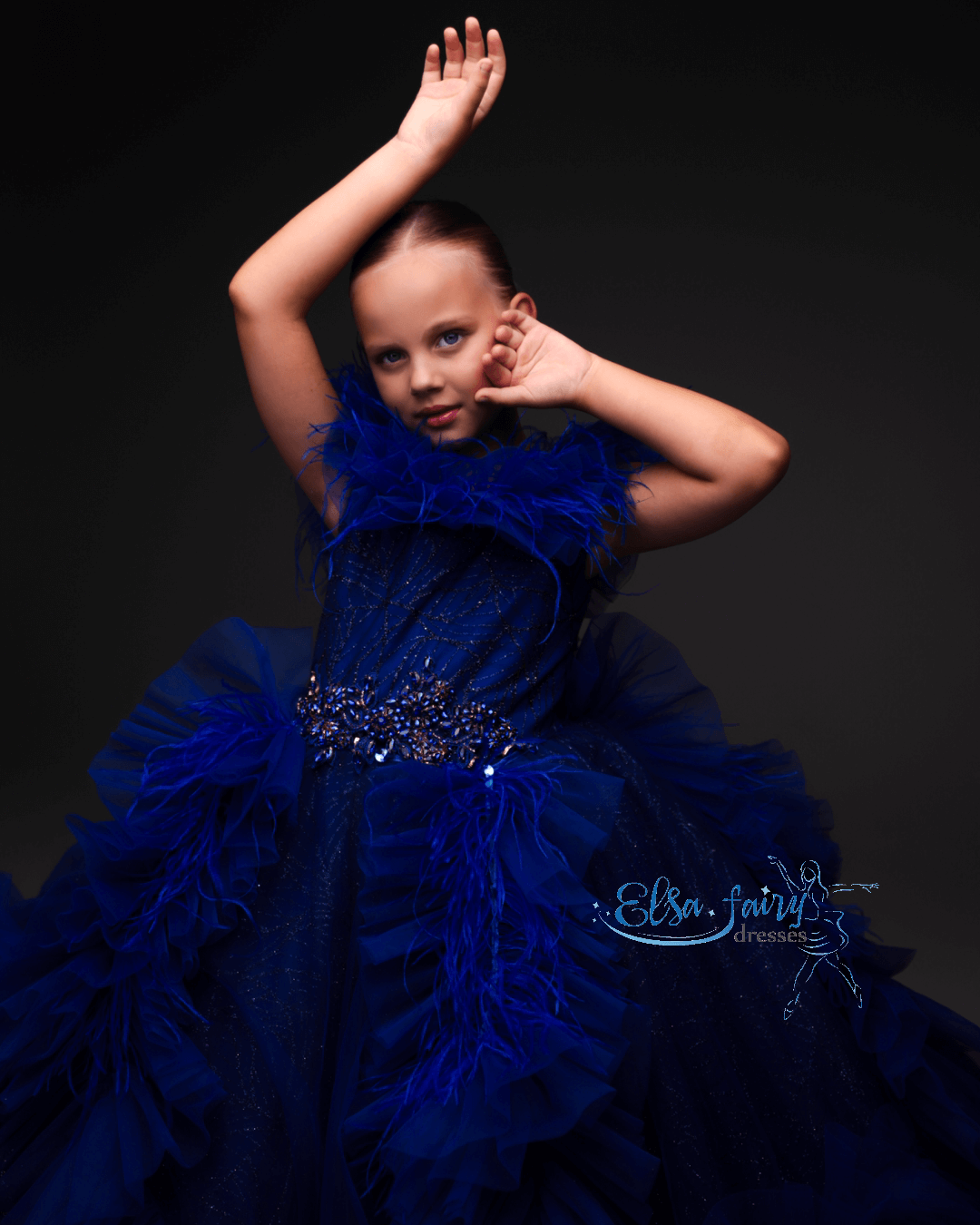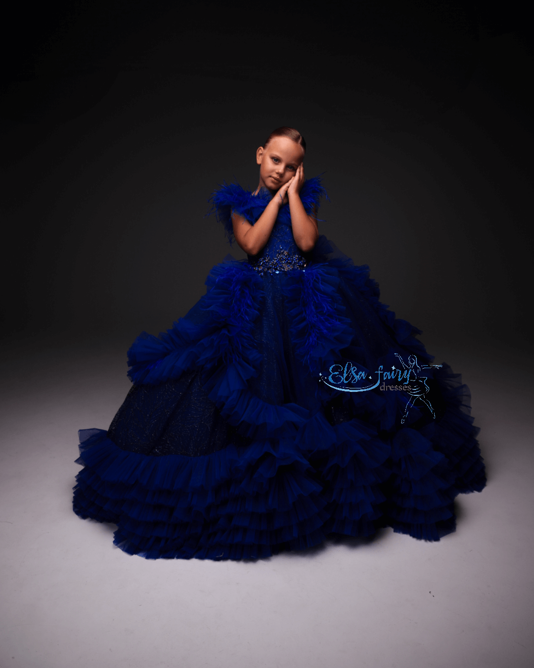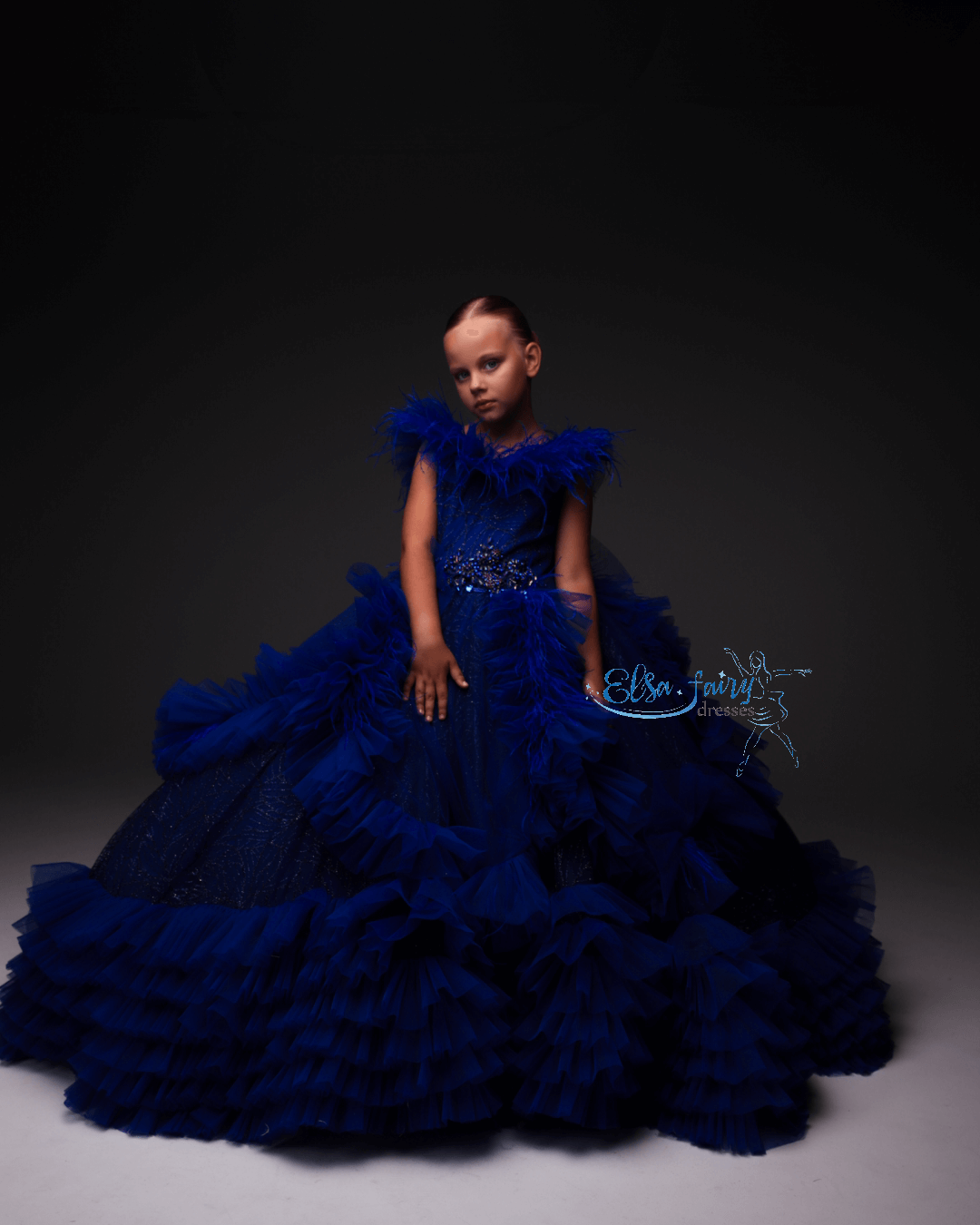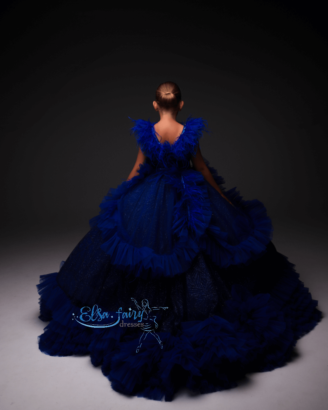 Luxury evening gown, exclusively designed and created by pre order for each customer. A floor-length handcrafter multi layered asymmetrical skirt with feathers, beautiful laced bodice with a V-neckline. The back features a multi layered train, decorated with feathers, adding a touch of glamour.