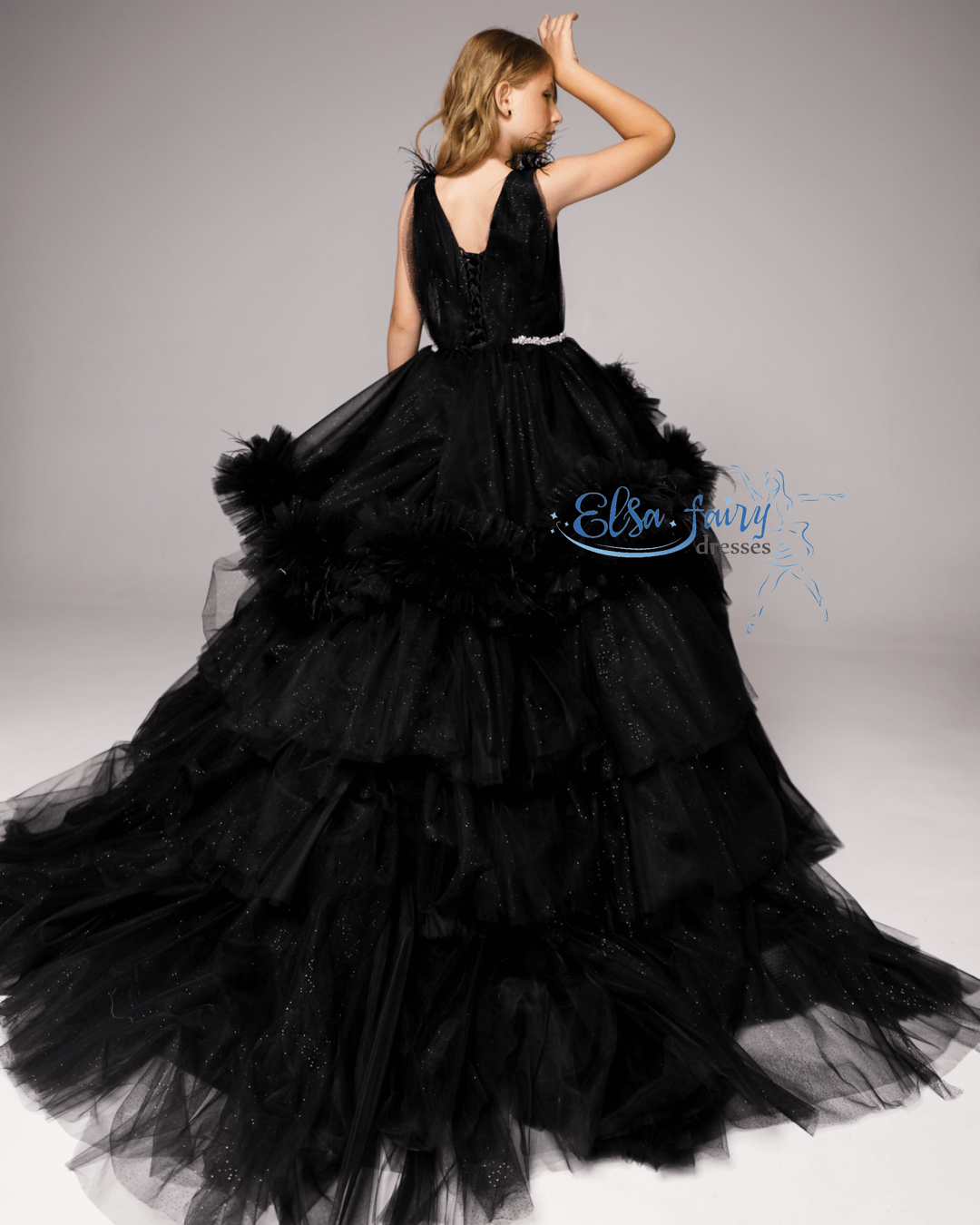 Luxury evening gown, exclusively designed and created by pre order for each customer. A floor-length handcrafter multi layered asymmetrical skirt with feathers, beautiful laced bodice with a V-neckline. The back features a multi layered train, decorated with feathers, adding a touch of glamour.