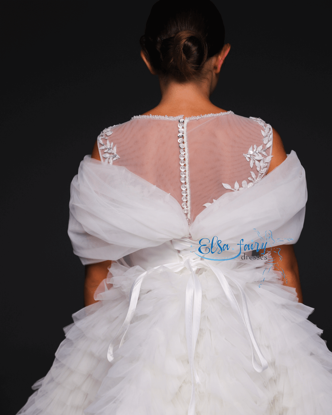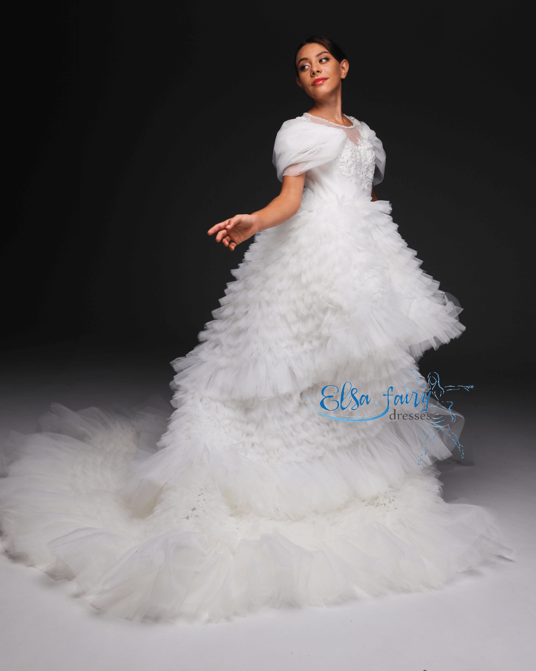 Luxury evening gown, exclusively designed and created by pre order for each customer. A knee-length handcrafter multi layered tulle skirt with detachable long tulle skirt, beautiful laced bodice with a boat-neckline. The back features a long multi layered train, adding a touch of glamour.