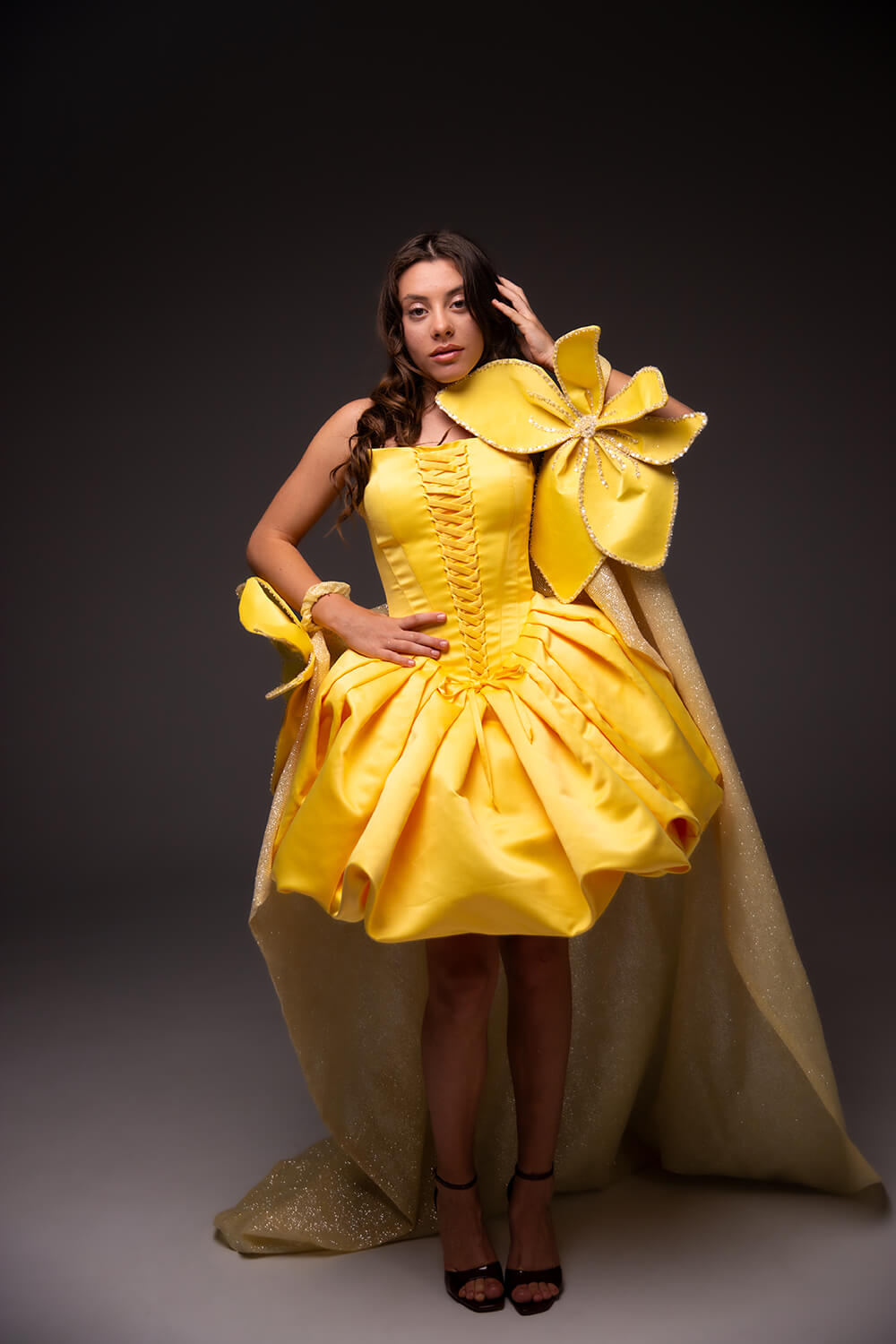 Radiating joy and regal charm, the Golden Bloom gown is a masterpiece of sculptural fantasy. The corset bodice, detailed with precision lacing, flows into a voluminous bubble skirt that captures movement and drama. A statement oversized floral applique graces the shoulder, echoed by a glowing golden cape that glimmers with soft sparkle and grandeur.