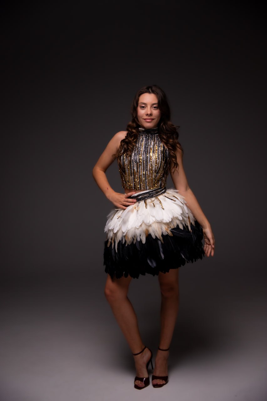 Fierce, flamboyant, and impossibly chic — the Golden Plumage ensemble channels high drama with a couture edge. The look pairs a high-neck fitted top, drenched in cascading gold and black sequins, with a voluminous mini skirt made entirely of ombré feathers in shades of white, ivory, and jet black.