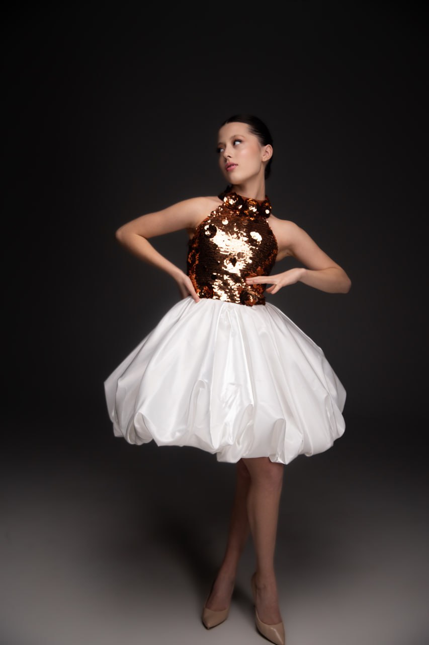 Where shimmer meets structure, the Moondrop Spark gown reimagines party elegance with a bold twist. The high-neck bodice dazzles in bronze sequins, radiating warmth and confidence. Balanced with a voluminous bubble skirt in crisp white taffeta, the silhouette brings playful contrast and sculptural charm.