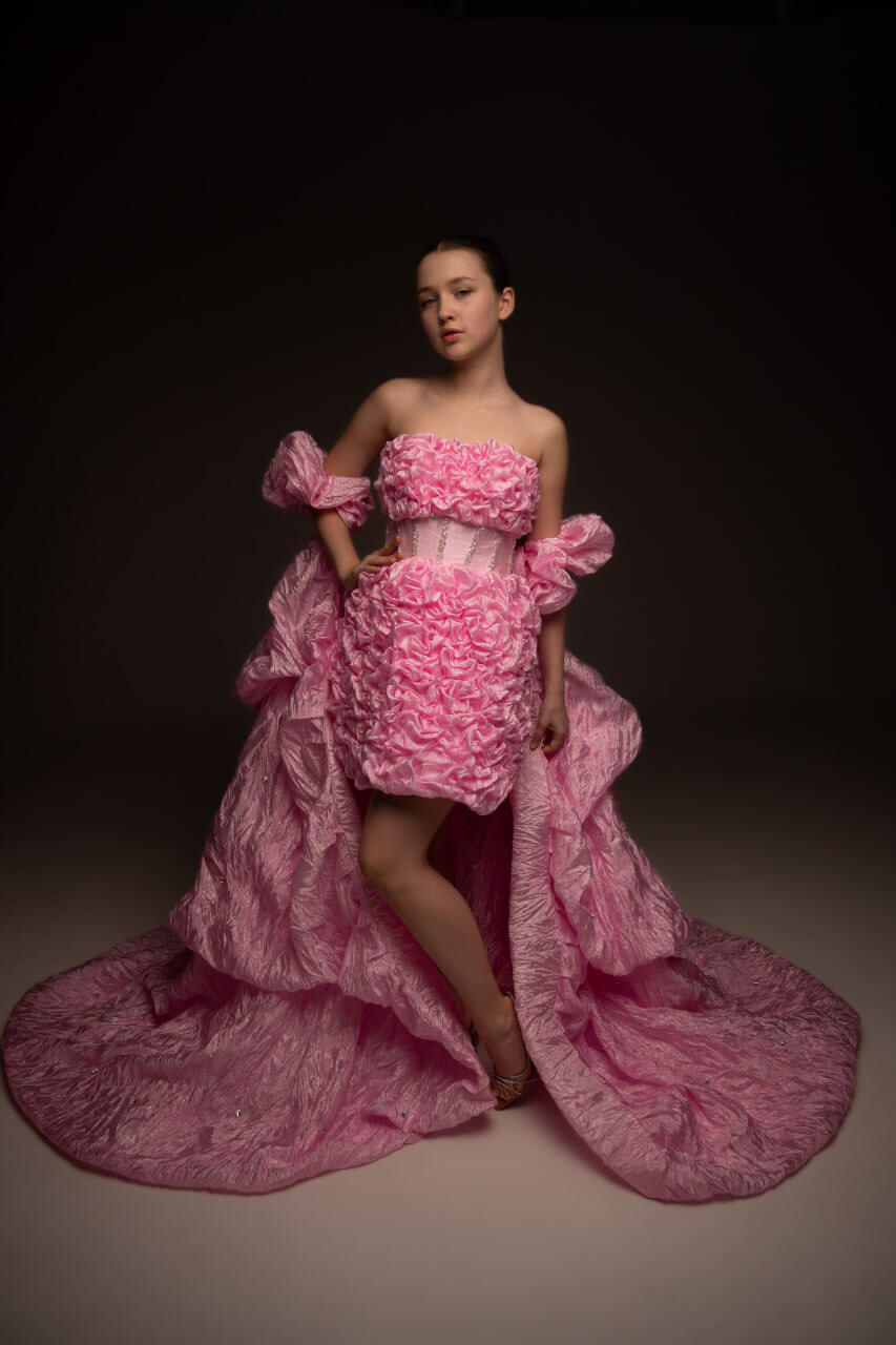 Voluminous, vibrant, and royally feminine — the Rosette Royale gown is a celebration of grandeur with a playful heart. The fitted, textured mini dress features lush rosette ruching and a structured corset bodice, offering elegance with a hint of mischief. Billowing off-the-shoulder sleeves and an extravagant train in crinkled pink taffeta complete the look, transforming every step into a statement.